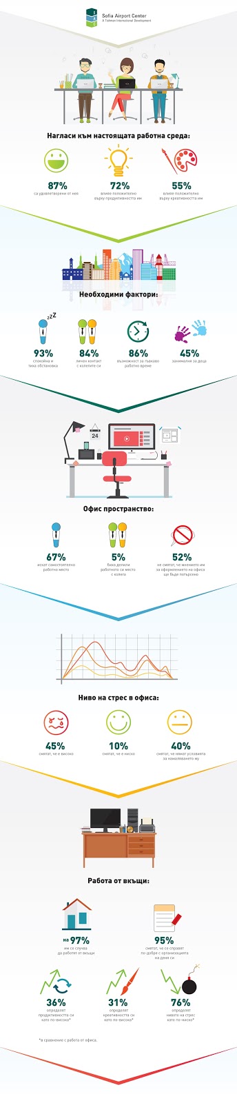 Голяма част от тях посочват, че настоящата им работна среда влияе добре върху продуктивността и креативността на служителите, но все пак 45% определят нивото на стрес в офиса като високо. В допълнение, всеки трети смята, че не са налице необходимите условия за намаляване на стреса, а едва десет биха нарекли нивото на стрес „ниско“.
