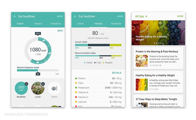 В Galaxy App store съществуват множество продукти, специализирани в отчитане на калории, въглехидрати, здравни тестове, свързани с диабет и много други. Непрекъснато се появяват нови и нови приложения за храни и хранене, давайки възможност на хората да се възползват от много и различни възможности.