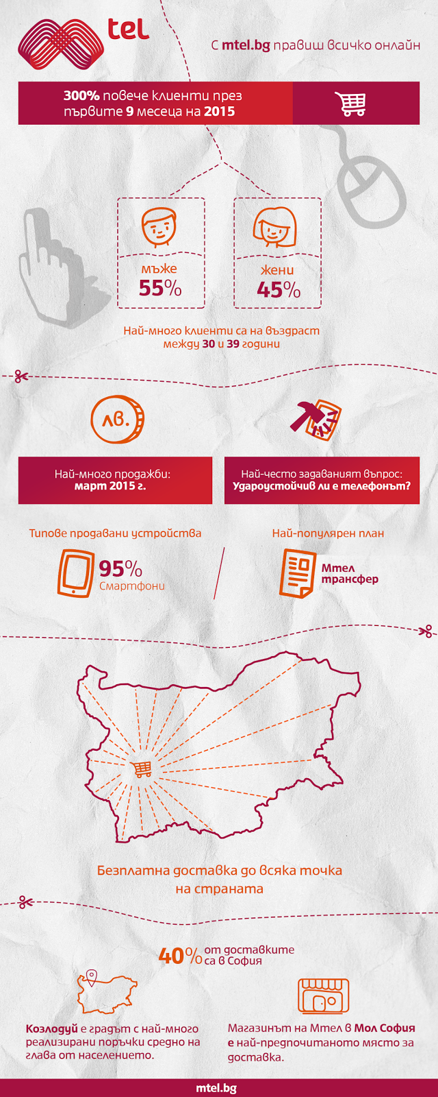 Доставката на всички стоки, закупени от електронния магазин на Мтел, е безплатна за цялата страна. Освен това, клиентите могат сами да изберат начина на плащане – чрез наложен платеж или в Мтел магазин. Около 40% от онлайн поръчките тази година са за столицата, като софиянци най-често желаят да получат избрания от тях продукт в магазина на телекома в Мол София. Любопитното е, че най-много покупки в онлайн платформата средно на глава от населението са направили жителите на Козлодуй.