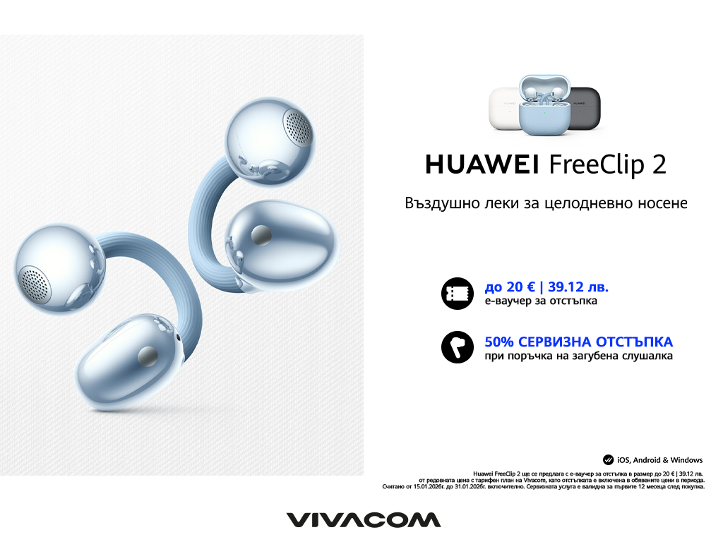 Безжичните слушалки Huawei FreeClip 2 се предлагат с до 20 € |39.12 лв. отстъпка с планове Unlimited и на свободна продажба, а в комбинация с 24-месечен абонаментен план Unlimited MAX се предлагат на лизинг за 24 месеца на цена от 6.16 € | 12.05 лв./мес.