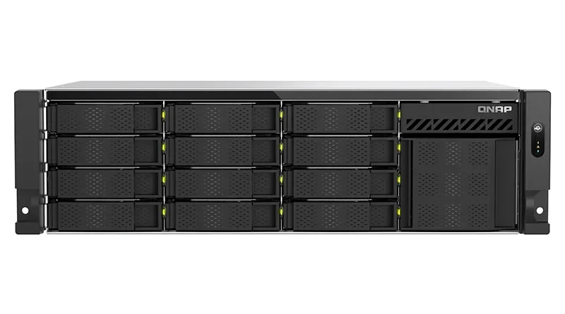 Моделът работи със ZFS-базираната операционна система QuTS hero, която предлага механизми за защита и целостта на данните, включително самовъзстановяване, компресия, дедупликация и поддръжка на снапшоти. NAS системата разполага с общо 16 хибридни слота за съхранение – 12 за 3,5-инчови SATA дискове и 4 универсални E1.S/M.2 PCIe NVMe слота, които могат да се използват за SSD кеширане или създаване на високоскоростни сторидж пулове.