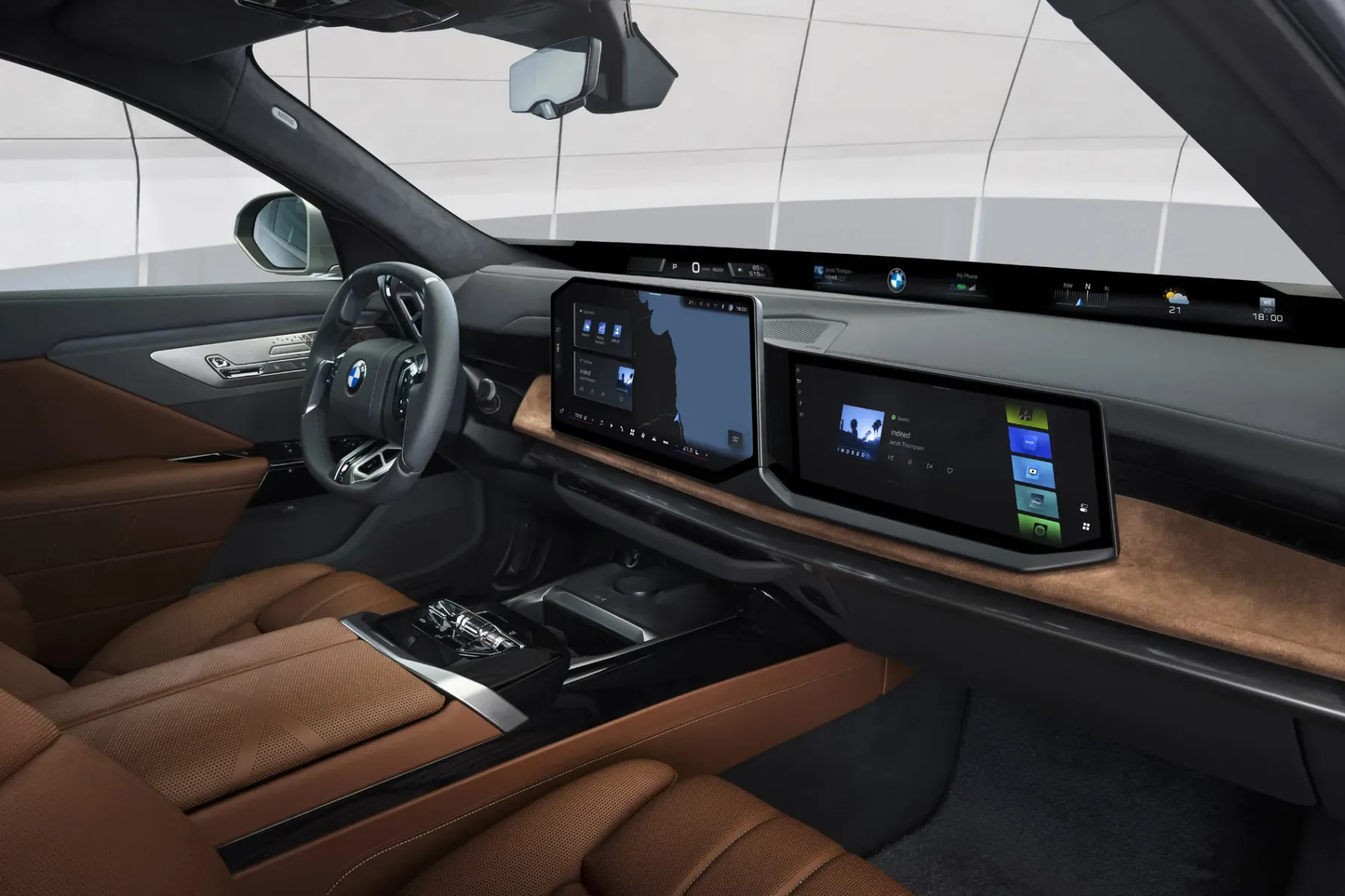 Интериорът също е сред най-сериозно обновените зони. Новата Серия 7 получава BMW Panoramic iDrive с Operating System X, а за първи път в модел на BMW дебютира и BMW Passenger Screen за пасажера отпред. Сред акцентите са още обновеният BMW Theatre Screen с поддръжка на 8K стрийминг, игри и видеоразговори, нова светлинна концепция в купето, аудиосистема Bowers & Wilkins с Dolby Atmos, както и богати възможности за персонализация на атмосферата в салона. BMW добавя и нов дигитален вътрешен огледален дисплей, който ще бъде въведен от ноември 2026 г.