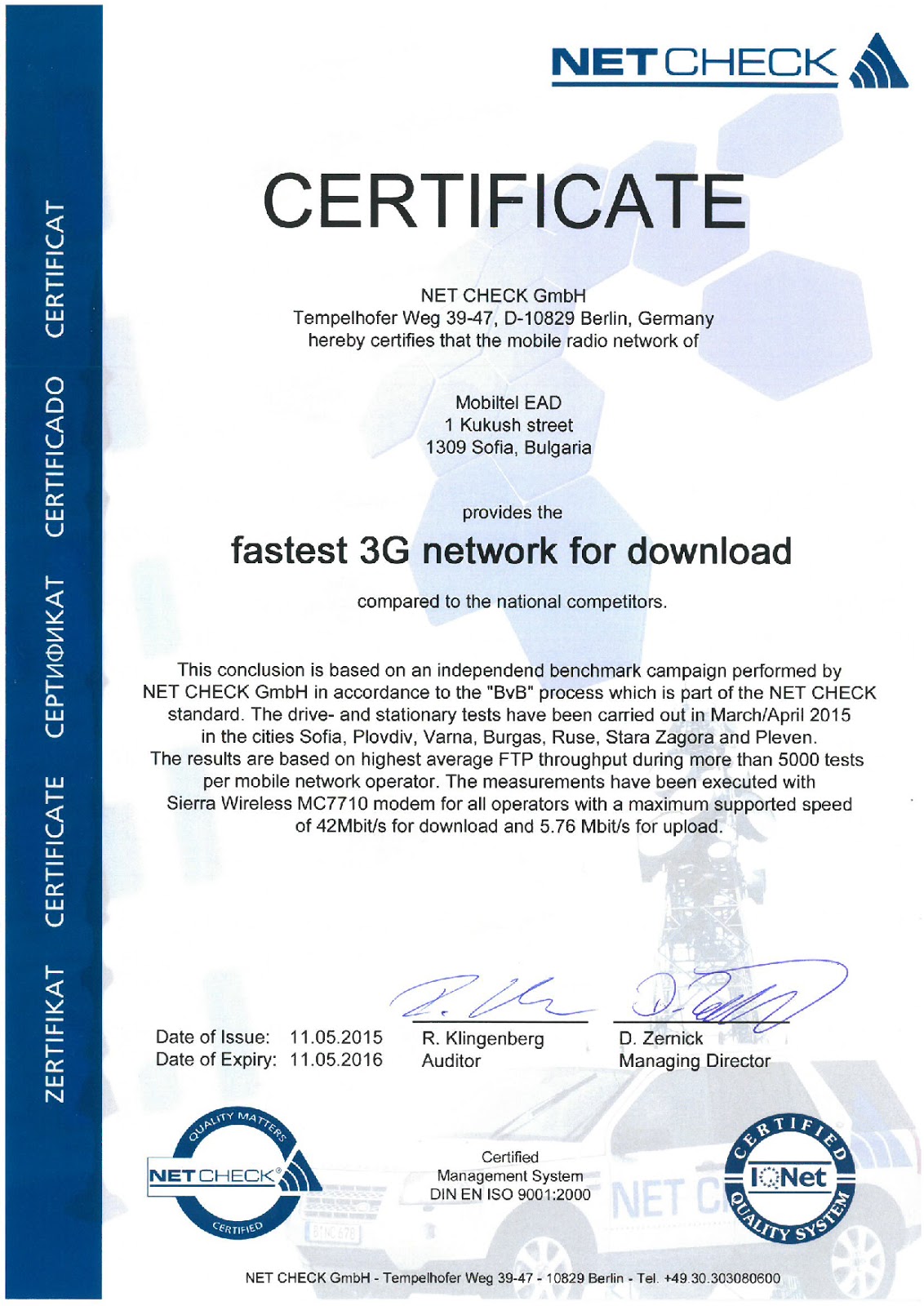 За пета поредна година компанията за контрол на качеството на мобилните оператори NET CHECK сертифицира 3G мрежата на Мтел. Всяка година германските експерти тестват мобилните мрежи на телекомите у нас. Сертификатът, който Мтел получава за 2015 година, е за „Най-бърза 3G мрежа за даунлоуд в България“.