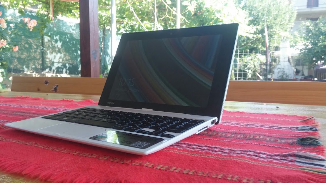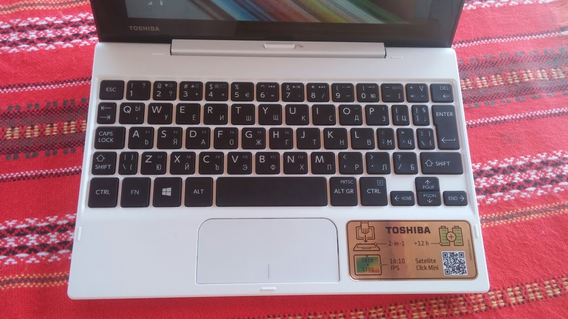 Настоящият модел на Toshiba, Satellite Click Mini L9W-B-102, с който разполагам залага също на достъпност ценово, като въпреки това предлага и сравнително добри характеристики. Той предлага пълнофункционален Windows базиран таблет с удобството на хардуерна клавиатура включваща допълнителна батерия.