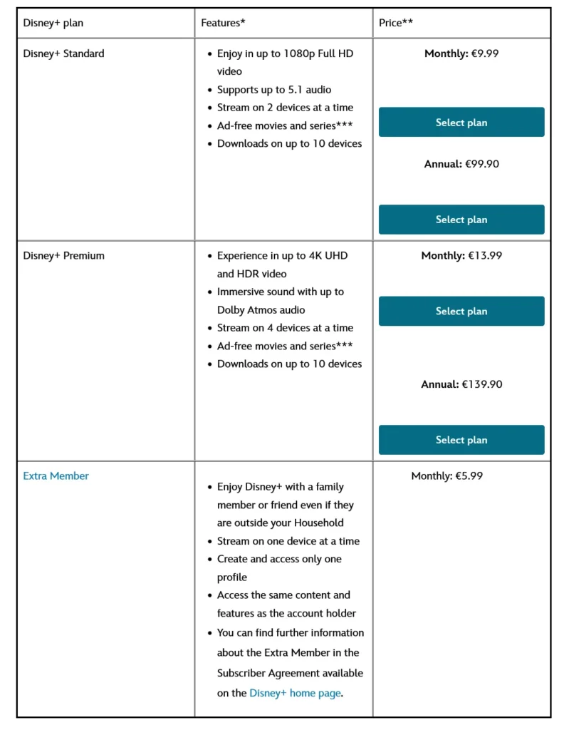 Disney+ има две абонаментни нива, Standard и Premium, които са с цени от съответно 9.99€ и 13.99€ на месец или 99.90€ и 139.99€ за година. Ако искате да добавите допълнителен потребител извън домакиснтвото си можете да направите това за 5.99€ на месец.