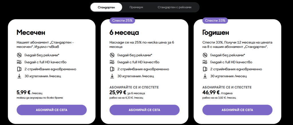 Стандартен с реклами дава Full HD качество и опция за гледане на едно устройство в даден момент.