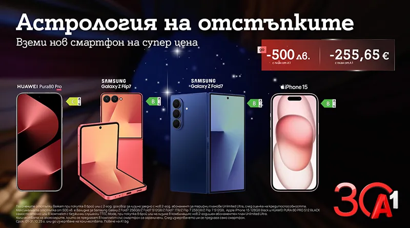 А1 празнува 30 години с отстъпки до 500 лева/255,65 евро за водещи смартфони