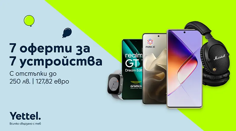 Онлайн магазинът на Yettel празнува седмата си годишнина с празнични оферти и специални отстъпки. До края на октомври потребителите могат да се възползват от намаления до 250 лв./ 127,82 евро при покупка на устройства в брой или на лизинг, в комбинация с избрани планове Total и Total Unlimited.