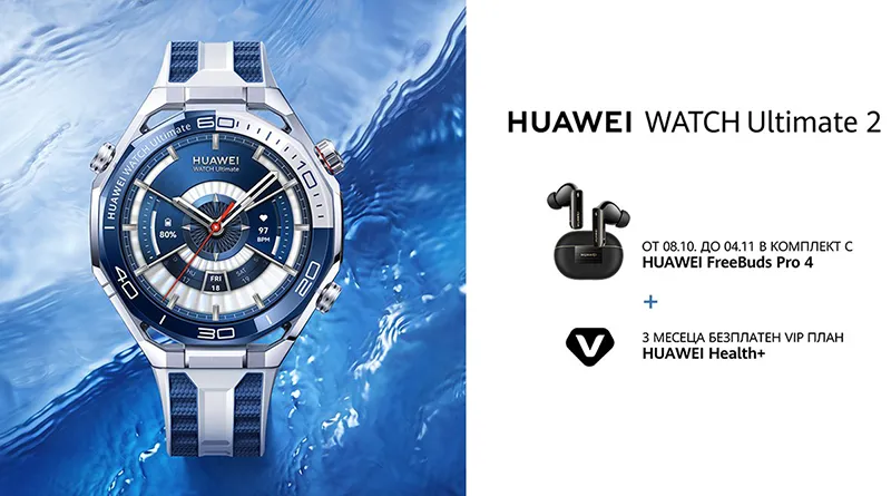 Новият ултра смарт часовник на Huawei Watch Ultimate 2 е достъпен в България, обявиха от компанията. Моделът се предлага в комплект с безжичните слушалки Huawei FreeBuds Pro 4 и тримесечен достъп до услугата Huawei Health+, като промоционалният период продължава до 4 ноември 2025 г.