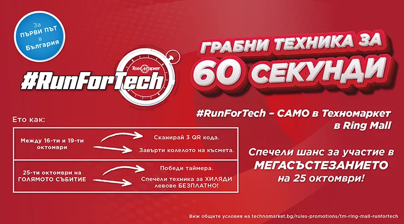 На 25 октомври 2025 г. от 14:00 ч. в магазина на „Техномаркет“ в Ring Mall ще се проведе състезанието #RunForTech. Трима участници ще имат по 60 секунди, за да съберат техника от магазина, като участникът с най-висока обща стойност на избраните продукти ще получи всичко без заплащане.