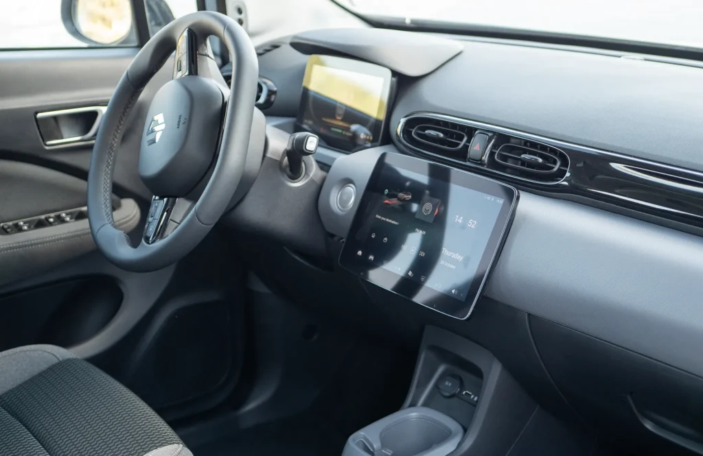 Засега в T03 няма вградена навигация или Android Auto/CarPlay поддръжка, но според официалната информация те ще бъдат добавени с бъдеща актуализация до края на годината, което е съвсем скоро. Иначе самият софтуер е стабилен и бърз. Лостът за скорости (автоматик) е отдясно на волана, а отляво е този за мигачите и чистачките.