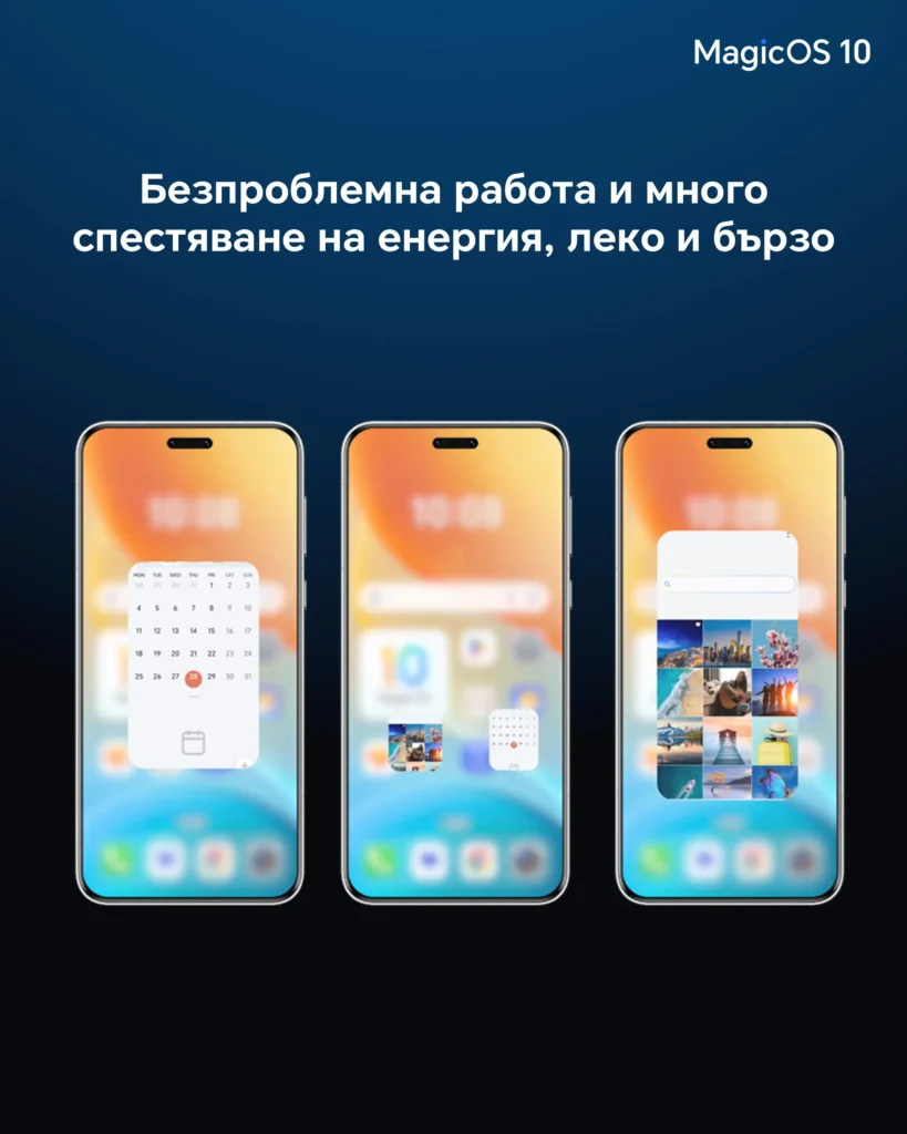 MagicOS 10 оптимизира системната производителност, осигурявайки по-бърза реакция и по-ефективно използване на ресурсите. Подобренията в HONOR Seamless Smart Connectivity позволяват лесно и сигурно споделяне на съдържание не само между устройства HONOR, но и с iPhone, като така се разширява екосистемната свързаност и за потребители на iOS.