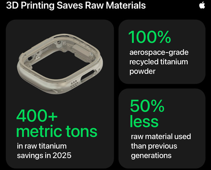 Цялата електроенергия, използвана за производството на Apple Watch, вече идва от възобновяеми източници. Компанията подчертава, че 3D печатът е ключов фактор в намаляването на отпечатъка от материали по пътя към целта въглеродна неутралност до 2030 г.