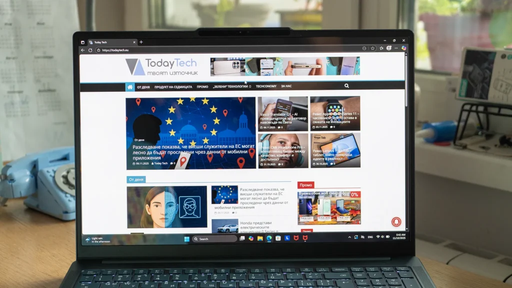 Освен това Lenovo предлага Smart Share, което позволява бърза връзка между смартфон и лаптоп чрез докосване – за прехвърляне на снимки, редакции или дори писане на съобщения директно от компютъра. Софтуерно моделът идва с Windows 11, Lenovo Vantage и достъп до Adobe Creative Cloud за два месеца безплатно.