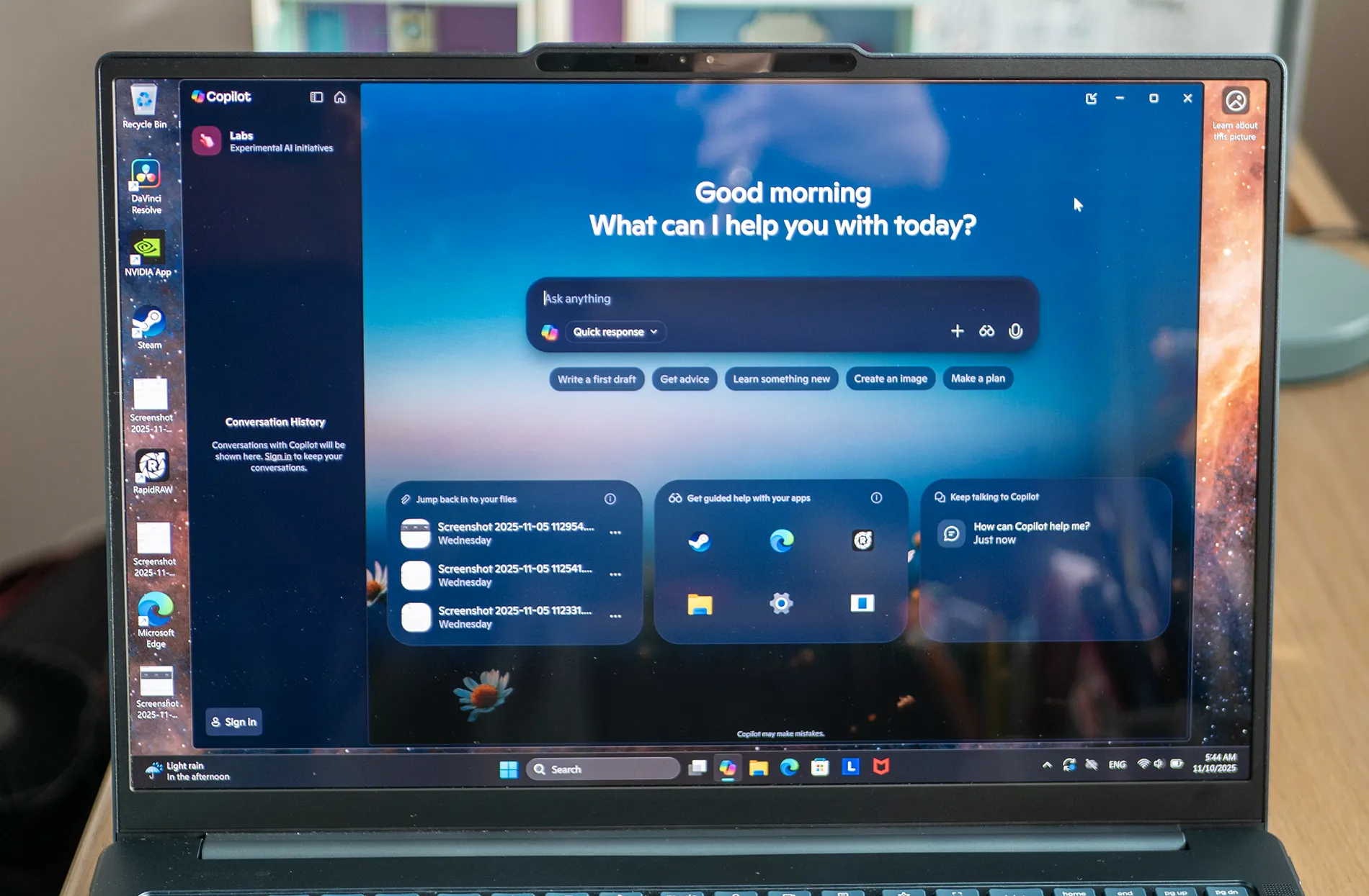 Лаптопът идва с вграден чатбот с изкуствен интелект Copilot, който може да се стартира директно от клавиш в клавиатурата.