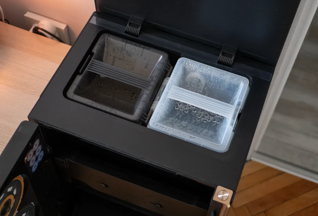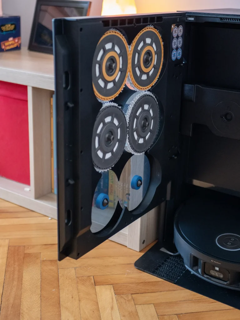 Станцията разполага и с отделни резервоари за чиста и мръсна вода, като целият процес по пълнене и изпразване се извършва автоматично. Роботът зарежда чиста вода за мопинга директно от дока, а използваната вода се събира в отделен контейнер, без смесване. Това позволява поддържане на постоянен контрол върху качеството на почистването и елиминира нуждата потребителят да се намесва след всеки цикъл.
