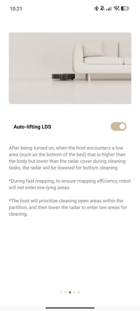- прибиращ се LiDAR/система за 360° сканиране, за да може роботът да се снижи и да влиза под ниски мебели (около 8,9 см височина при прибрано положение);