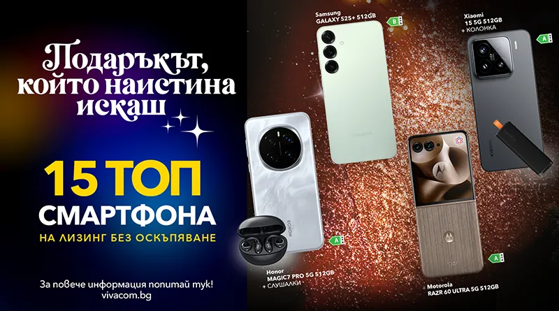 Vivacom представи празнични предложения за свои клиенти, валидни от 10 декември 2025 г. до 8 януари 2026 г. Кампанията включва селекция от смартфони, предлагани на лизинг без оскъпяване спрямо цената при еднократно плащане, при сключване на 24-месечен договор с тарифни планове от семейството Unlimited.