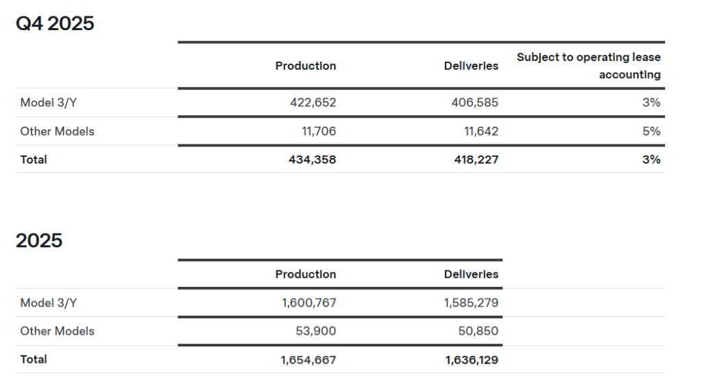 За цялата 2025 г. Tesla е произвела 1 654 667 автомобила и е доставила 1 636 129. От тях 1 600 767 са произведени Model 3 и Model Y, с доставки от 1 585 279 броя. Останалите модели възлизат на 53 900 произведени и 50 850 доставени автомобила.