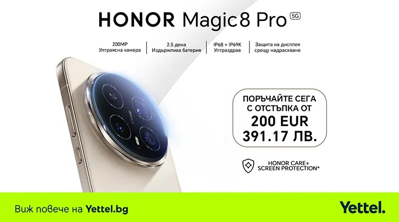Yettel стартира предварителните поръчки за новия флагмански смартфон HONOR Magic8 Pro. Клиентите могат да направят заявка онлайн от 15 до 29 януари 2026 г., включително, като в рамките на този период имат възможност да го вземат и с 200 евро (391,17 лв.) по-малко от редовната цена на модела.