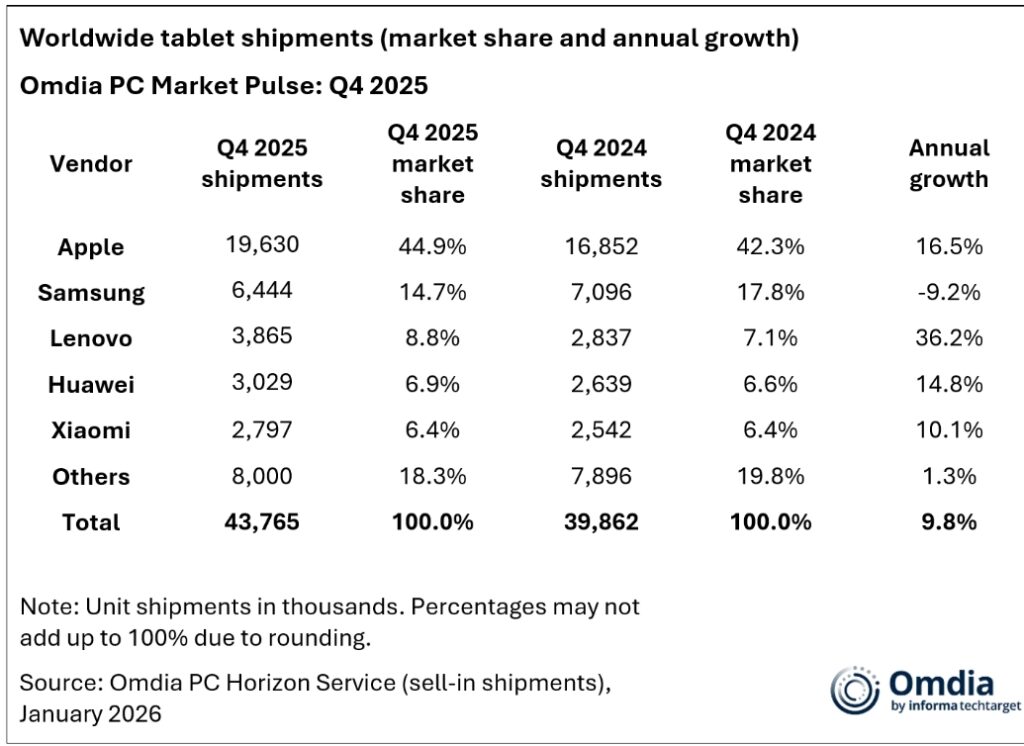 Глобалните доставки на таблети са се увеличили с 9,8% на годишна база през 2025 г., достигайки общо 162 млн. устройства. Това е най-високият годишен обем от 2020 г. насам, според ново изследване на анализаторската компания Omdia.