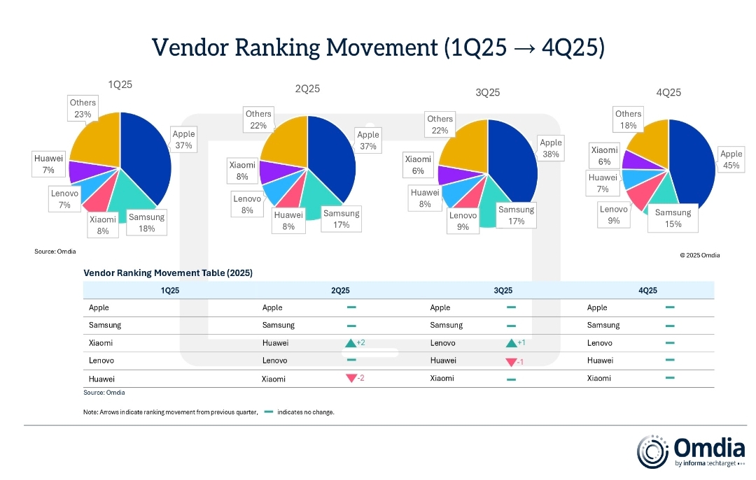 По отношение на производителите, през четвъртото тримесечие на 2025 г. първото място по доставки заема Apple с 19,6 млн. устройства, следвана от Samsung с 6,4 млн. броя. Lenovo отчита най-висок темп на растеж сред водещите компании, докато Huawei и Xiaomi допълват челната петица за периода.