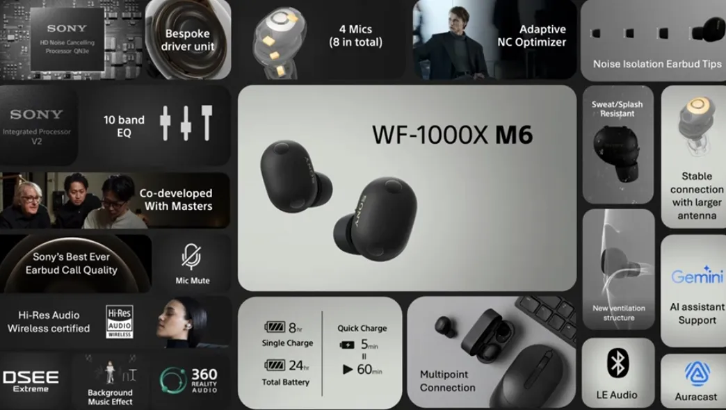 Sony представя новото поколение премиум напълно безжични слушалки WF-1000X M6, които надграждат серията с по-мощна аудио платформа, подобрена система за активно шумопотискане и разширена поддръжка на кодеци. Моделът комбинира хардуерни подобрения с AI алгоритми за по-прецизна адаптация към средата и потребителя.