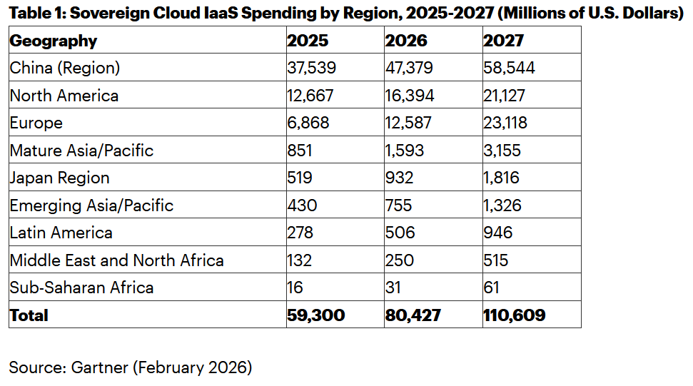 По региони се очаква Близкият изток и Африка, развитите пазари в Азия и Европа да отчетат най-висок темп на растеж през 2026 г. Китай и Северна Америка ще запазят водещи позиции по абсолютен обем на разходите, но с по-умерен ръст. Европа се прогнозира да изпревари Северна Америка по разходи за суверенен облак през 2027 г.