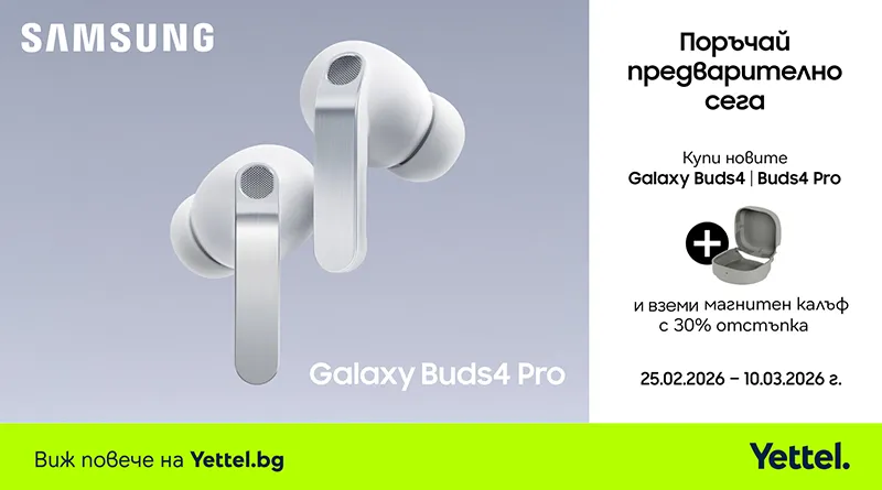 Паралелно с официалното представяне на новото поколение флагмани от серията S26, Samsung разширява и аудио портфолиото си с моделите Samsung Galaxy Buds4 и Buds4 Pro. Новите слушалки вече могат да бъдат предварително заявени от Yettel до 23:59 ч. на 10 март 2026 г., като при покупка на някой от двата модела, клиентът има възможност да закупи и сив калъф Magnet Stand с 30% намаление от редовната цена.