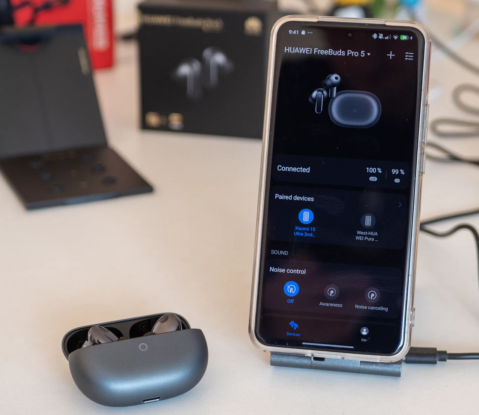 FreeBuds Pro 5 предлагат много добра издръжливост за този клас. При слушане без активно шумопотискане времето достига до около 9 часа с едно зареждане. С помощта на кейса общото време може да достигне приблизително 38 часа. При включено ANC издръжливостта логично намалява, но остава напълно достатъчна за ежедневна употреба.
