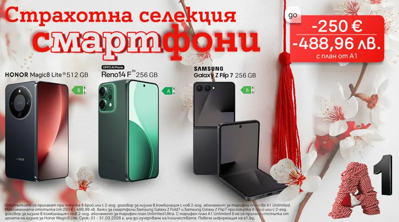 През март А1 предлага избрани смартфони с до 250 евро /488,96 лв. отстъпка в брой или на лизинг с план Unlimited. Кампанията е отлична възможност да обновите личното си устройство или да направите практичен подарък около 8 март на любима жена. В селекцията попадат модели с модерен дизайн, водещи камери и висока производителност, създадени да улесняват ежедневието – от работа и пътуване до свободно време и споделени моменти.