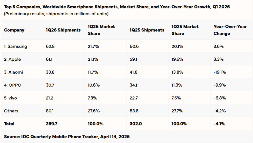 Световният пазар на смартфони отбелязва спад през първото тримесечие на 2026 г., като основната причина е сериозното поскъпване и ограничените доставки на памет. По предварителни данни на IDC глобалните доставки достигат 289.7 милиона устройства, което представлява спад от 4.1% на годишна база и прекъсва поредица от 10 последователни тримесечия на растеж.