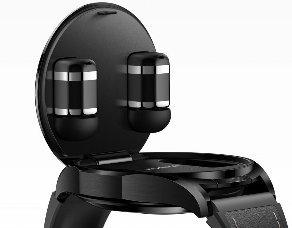 Основната идея зад HUAWEI WATCH Buds 2 остава непроменена – в корпуса на часовника са интегрирани две компактни безжични слушалки, които се съхраняват и зареждат директно в него. Според Huawei новият модел е с 12 грама по-лек спрямо предходното поколение, а теглото на самия часовник без каишката е около 54.5 грама. Дебелината достига 14.69 мм, което подсказва, че компанията е работила не само върху дизайна, но и върху по-комфортното ежедневно носене.